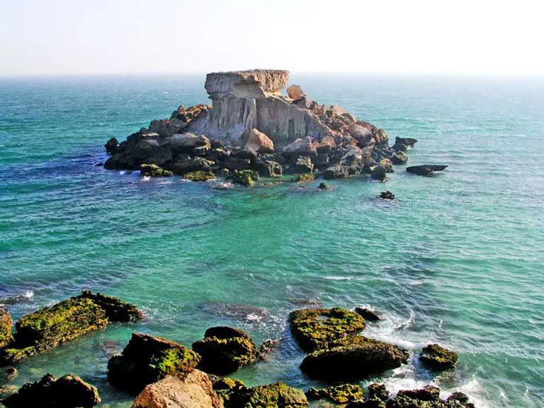 جزیره ناز یا جزایر ناز از زیباترین مکان های دیدنی قشم است. این جزایر در واقع سه صخرهاند که در میان دریا واقع شدهاند. زمانهایی که آب دریا پایین میرود، مسیری از ساحل به این صخرهها باز میشود و شما میتوانید با پای پیاده به این صخرهها بروید. ایستادن روی صخرهها و تماشای برخورد موج دریا با سنگ واقعا لذتبخش است. ضمنا اگر کمی دقیق شوید از همان بالا خرچنگهایی را میبینید که در پایین صخره اینطرف و آنطرف میروند.
